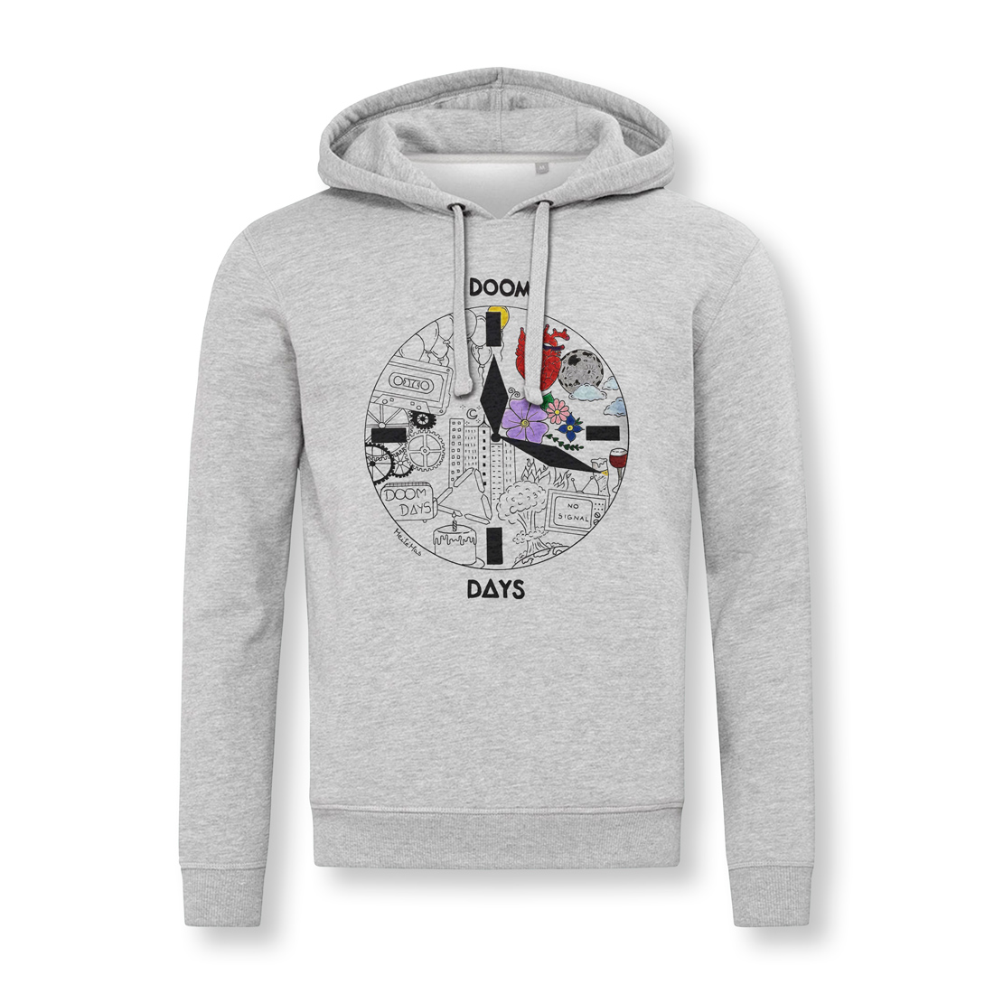 Pilkas džemperis su kapišonu ir kišenėmis šonuose.