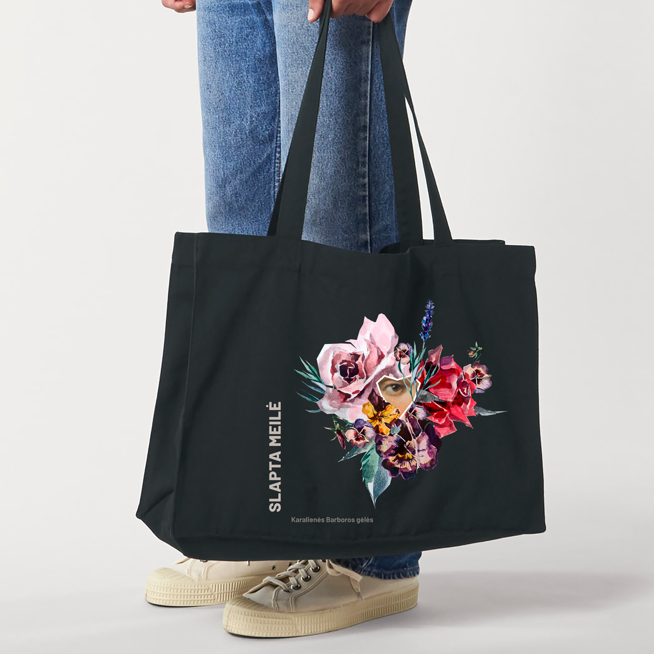 KARALIENĖS BARBOROS GĖLĖS Juodas perdirbtos medvilnės krepšys
