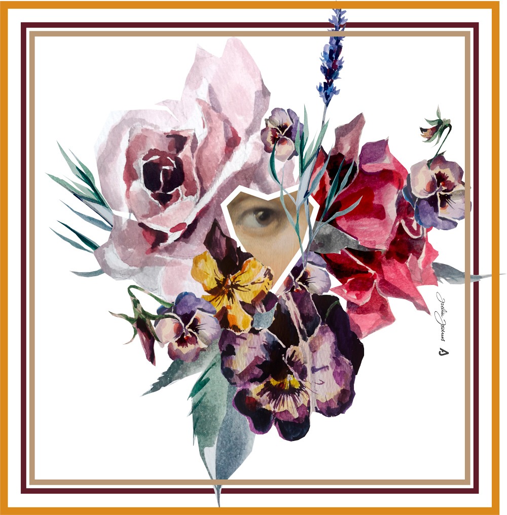 Andros koliažas spaudai ant skarelės – karalienės Barboros mėgstamų gėlių, Miglės Kosinskaitės paveikslo „Karališkos poros Žygimanto Augusto ir Barboros Radvilaitės portretas“, tapusio visos kolekcijos jungiamuoju elementu, fragmento panaudojimas.