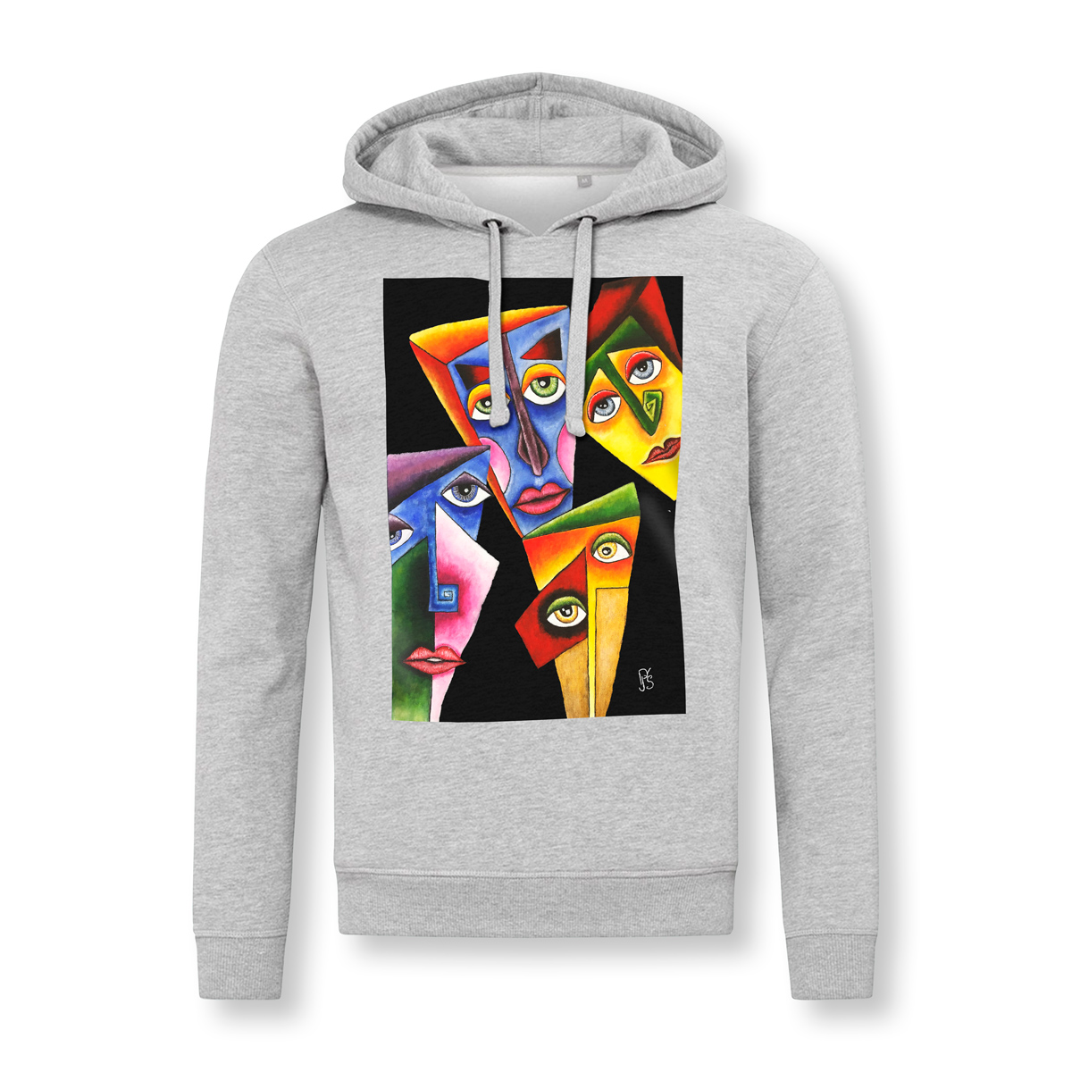 Pilkas džemperis su kapišonu ir kišenėmis šonuose.
