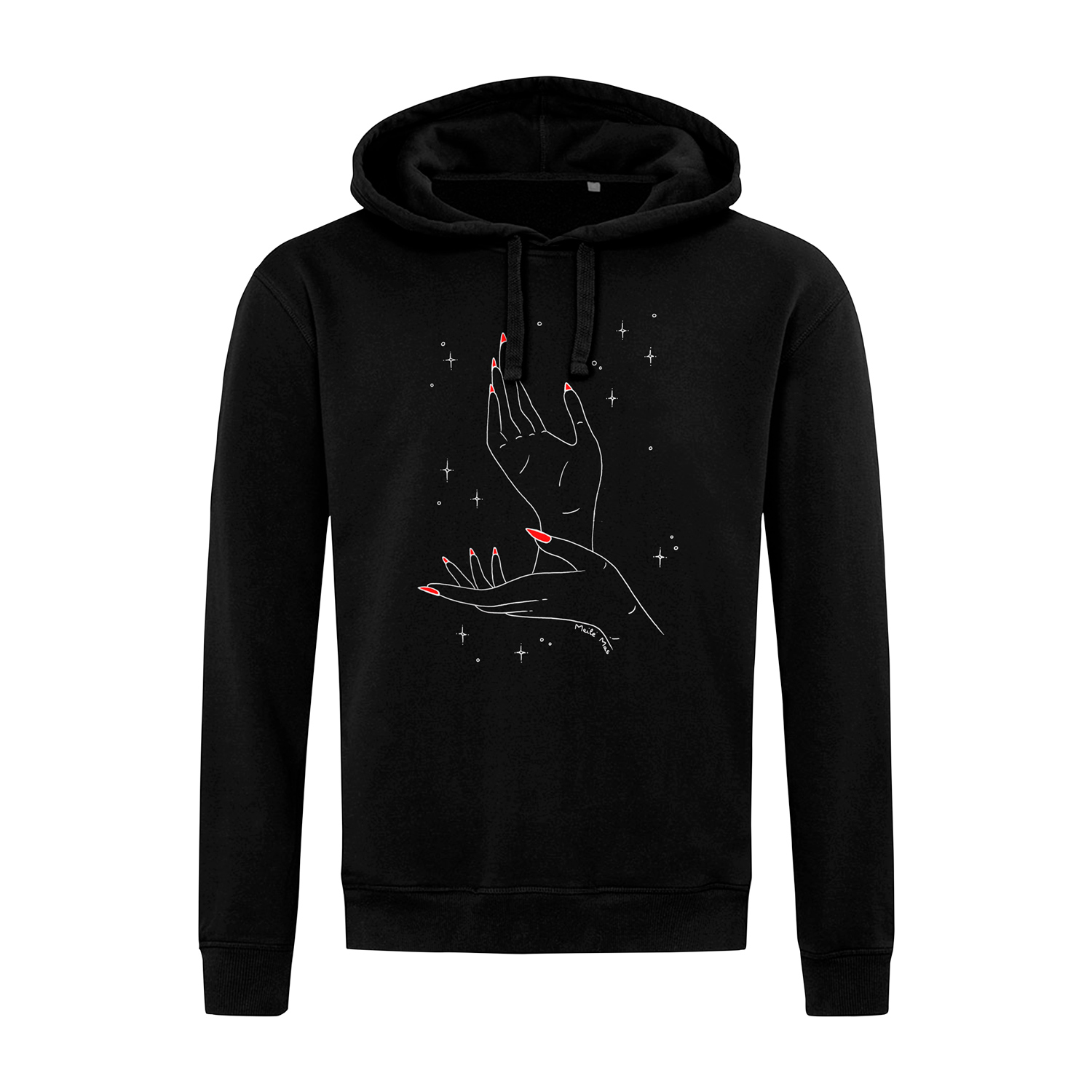 Juodas džemperis su kapišonu ir kišenėmis šonuose.
